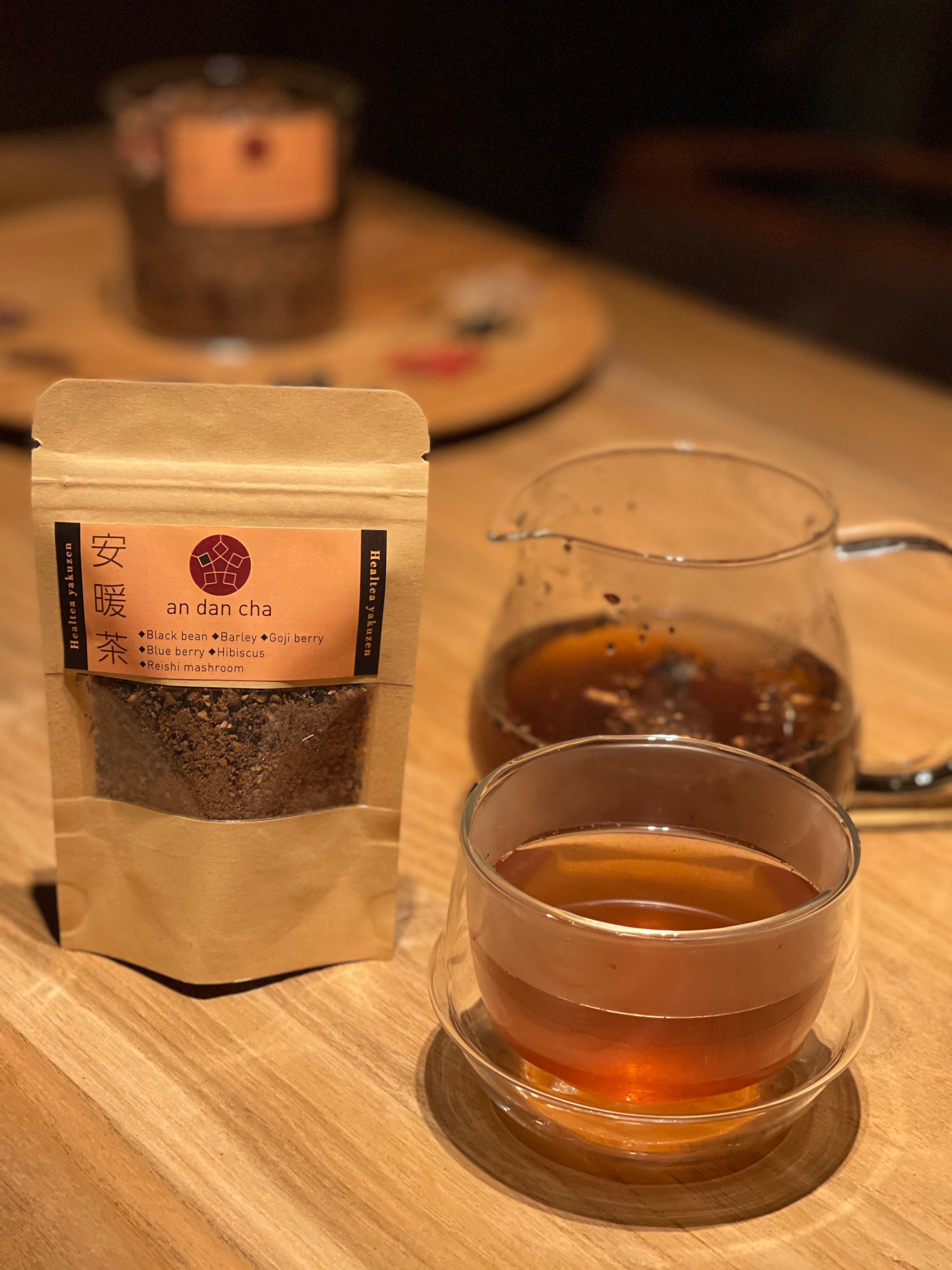 安暖茶は、黒豆の香ばしさと霊芝の深みを土台に、エゾウコギの落ち着いた風味、クコの実のやさしい甘み、ハイビスカスとブルーベリーの爽やかな酸味が重なり合う、心をふっとゆるめるブレンド。